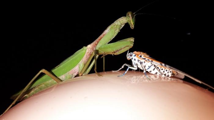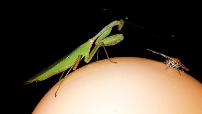 Они сидят на плафоне уличного фонаря. Богомол сантиметров десять.