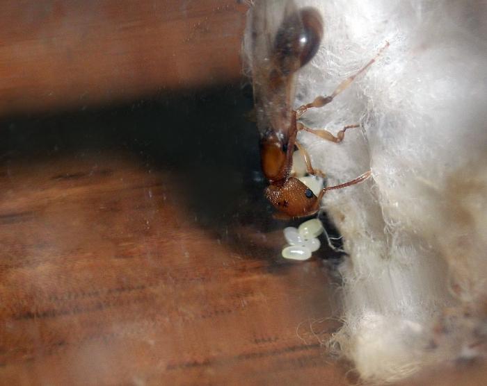 У крылатой матки из Тайланда количество яиц увеличилось и появилась одна личинка. Очень интересно посмотреть, кого она вырастит.