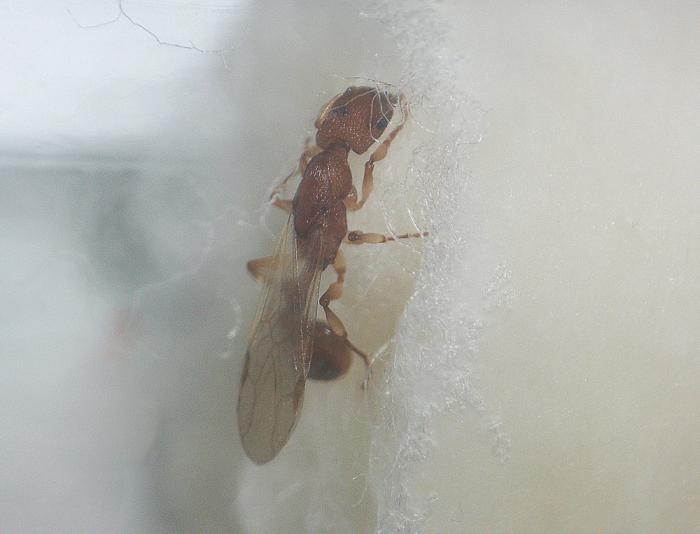 Из Тайланда прилетела еще вот такая крылатая матка. Не крупная, размер 8-9 мм. Вероятность, что оплодотворена, минимальная, поэтому решил не заводить отдельный блог. Живет уже почти месяц, шустрая, питается медом и дрозофилами, но крылья так и не сбросила и кладок нет.