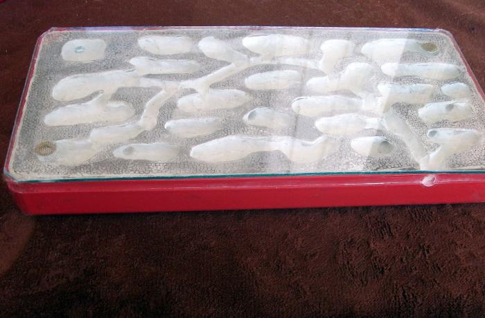 Тоже что-то не подумал, ну если надумаю перезаливать то обязательно сниму. Процесс взят вот здесь, только после выкладки брусков вниз уложил стекло и оставил по 1см. от краев чтоб получился бордюрчек и стекло укладывалось вниз. Предварительно сделав камеры из пластилина на стекле и придавив их ровной доской чтоб высота камер была одинаковой. Хотя в дальнейшем пластилин использовать не буду так как купил себе набор шарошек =)