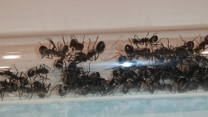 Недавно я приобрел семью муравьев Polirhachis dives. Они приехали ко мне в пробирке. Я переселил их в формикарий. Было две матки. Едят белок. Пьют воду. Фотографии ниже.