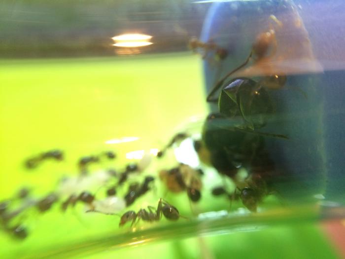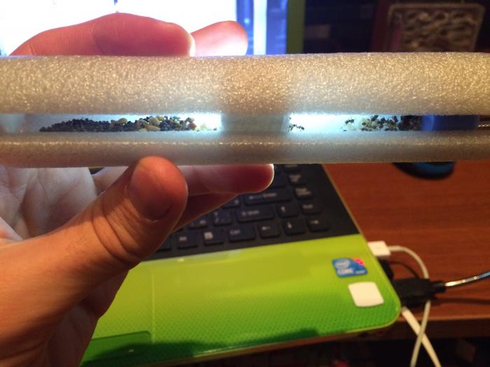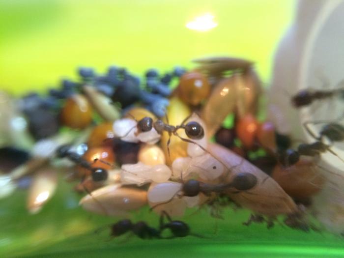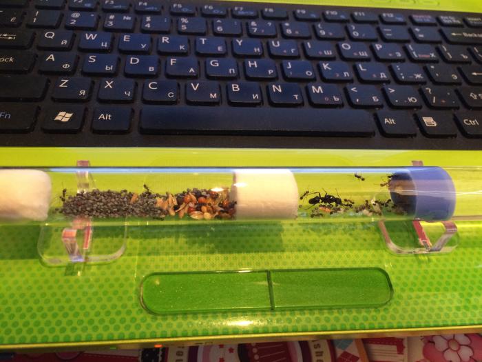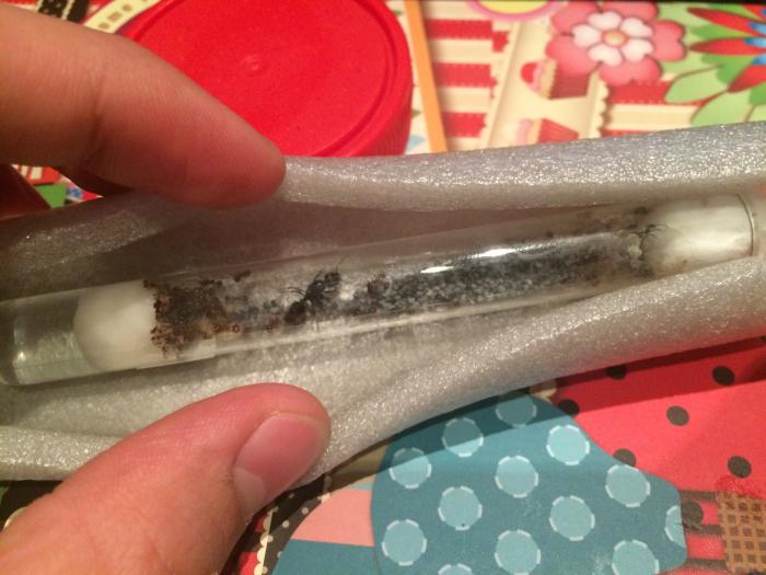 Получил колонию с маткой у которой придавлено брюшко в дар из приюта AntPlanet, спасибо им за то, что выбрали меня, так как желающих было много. Приехав за ней к ним офис 26.08 я впервые увидел эту калеку :D которая в принципе ни чем не отличалась по поведению от здоровой матки и уже успела вопроизвести около 30+ муравьев. Были они в маленькой пробирке только с семенами мака. По приезду подключил большую двух камерную пробирку, насыпал разнообразных семян, затемнил ее и стал ждать их переезда. Перебрались сами за ночь, забрав с собой весь запас мака. Утром видел как уже перемаловали просо.
