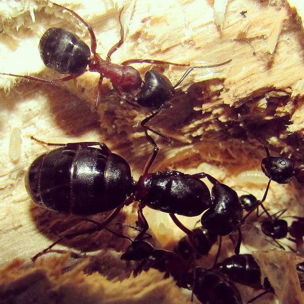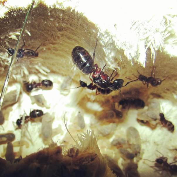 Тем не менее, у меня есть две запасные матки геркулеанусов. пойманные ещё весной. Не могу точно сказать, что они оплодотворены. У некоторых случались случаи, что ловили маток кампов без крыльев и потом не дай бог выводились самцы. Вот так вот. Но одна из маток мне нравится поведением, она заботливая, ходит нехуденькая довольно-таки, плотненькая такая, и даже смотрится крупней по сравнению с другой маткой. Ну так вот, ей я подкидывал куколку рабочего в прошлом году ещё, из неё вывелся рабочий, потом я ей подкидывал личинки самцов, и после диапаузы она начала их растить, точнее растить только одну, и молго ли это значит, что она неоплодотворена? Вс-таки, потом она отложила яйца, и вот наконец-то у неё появились личинки, личинки точно рабочих вроде, но потом одну крупненькую личинку она съела, а вторую оставила, плюс ещё несуколько мелких личинок. Но матку всегда кормил рабочий, плюс она сама ела белковый корм - мух. Но поведением она напоминает заболивую мамашу, всегда маиться с расплодом. Если толстеет, то значит нужно ожидать кладку яиц, у неё это принцип. Ну так вот, мне кажется, что она полодотворена, хотя, не факт.Вторая противоположность ей, худенькая, мало занимается с расплодом, но тем не менее вырастила 4 личиночек, плюс даже отложила ещё яйца, но я точно не знаю, ведь всё возможно, но как мне кажется, что одна из них точно оплодотворена, но тоже не факт. покажет время.