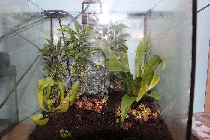 Брать ткачей меня заставил освободившейся терр от паука и конечно же знаменитый блог S.T.E.L.S,а о них. Про терр: переделан из 30 литрового аквариума с размерами 30/30/30. В качестве грунта использовалась кокосовая стружка. Понятия не имею какие растения у меня растут, брал в ОБИ. Знаю только, что одно из них хищное. Так как я еще и аквариумист, я очень люблю воду, поэтому во всех террариумах я делаю прудики, в некоторых уже пытался сделать ручей, но пока безрезультатно. Но я теперь точно знаю как сделать ручеёк в террариуме, поэтому для экофил (Я их рано или поздно добуду), у меня будет терр горизонтальный, с ручьем посередине. Ну, теперь про муравьев: ОНИ ВЕЛИКОЛЕПНЫ! Эти их шипы, золотистый перелив на теле, очень завораживающие. Банку я поставил прямо в терре, не хотел я использовать конструкцию инкубатор+арена, хотя при такой численности и можно было бы наверное. Выпустил их т.к. в природе то они сразу на открытом воздухе, так что я думаю обстроиться смогут. Дал им смоченную в сахарном сиропе ватку, кинул пару мушек. Позже кину еще туркмена разрезанного.