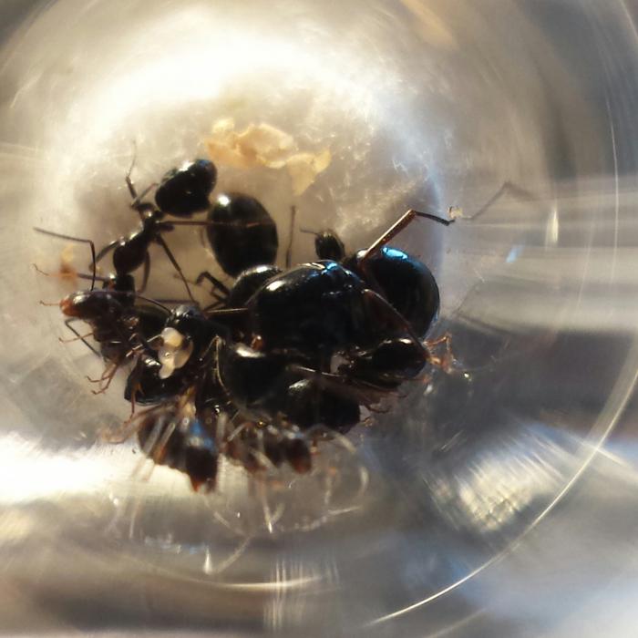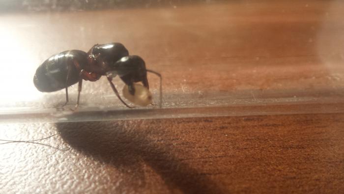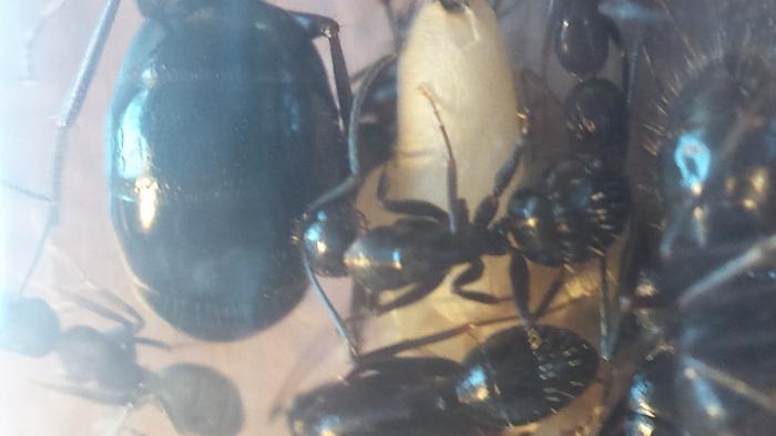 Этот пост не про эфиопсов,но они тоже там участвуют.Итак.У матки геркулануса личинка уж очень долго развивается,в то время как у эфиопсов личинки растут быстро.Думаю уже понятно,что я сделал-подкинул личинку эфиопсов геркуланусихе.И она ее приняла!Честно сомневался в этом т.к. они из разных подродов,но матка ее вылизала и при тревоге хватает ее и пытается спрятать.Вот фото(та что больше личинка эфиопсов)
