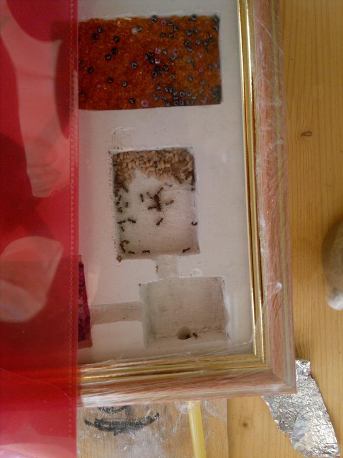 Так как форм первый, проходят полевые испытания увлажнения конструкции. Неделю не увлажнял, оставив на арене поилку из упаковки для бахил. Вечером прихожу домой а в формике всего пяток мурашей, история повторилась. Зато на арене весь расплод с маткой, около поилки. Эти сообразительные чертята сложили из бисера горку, и положили последний ряд так, чтоб пленка поверхностного натяжения воды в поилке прорвалась и намокло дно арены. Уровень влажности регулировали высотой горки бисера. Фото к сожалению сделать не успел.