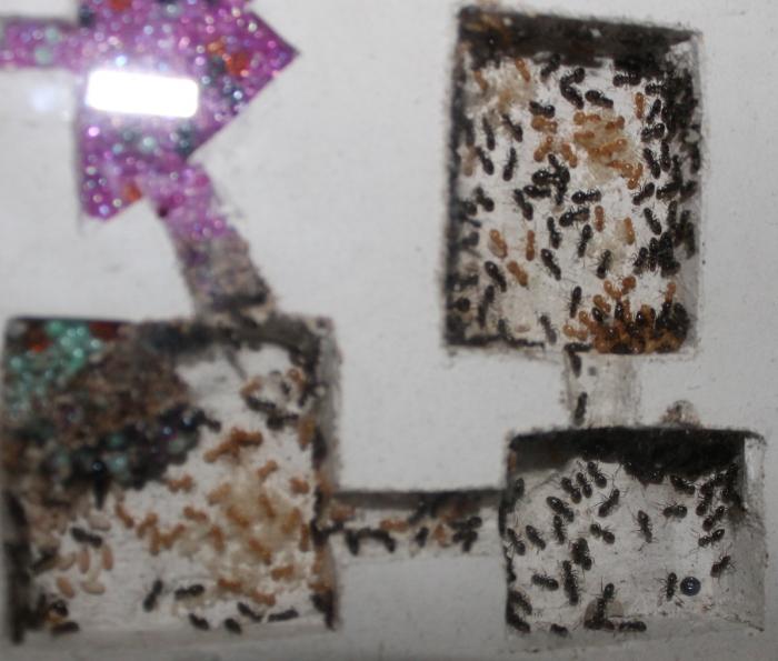 Еще один эксперимент состоял в анализе возможности перетаскивания бисера из камеры в камеру. Форм всегда накрывался красной розрачной папкой полностью, на снятие папки народ внимания не обращал. но стоило закрыть ею только камеру частично заполненную бисером, как весь расплод и матка перекочевали в затененную камеру. Но там же реально ТЕСНО!!??