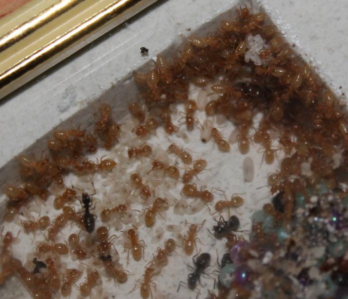 У моих паладинов очень хорошо просматривается цикличность в выращивании поколений. По началу относил эту цикличность к скудному кормлению по неопытности, но в последнее время кушанье у них разнообразное. В ход идут мухи, зофобас, тараканы. Гамарус и вареное яйцо обделено вниманием и полностью ушли на прокорм кормовой живности. И не смотря на постоянное наличие у них белкового корма матка выдает пакет яиц размером в 2-3 муравья и перестает нестись. Следущий запуск начинается когда яйца проходят стаз личинок и первые из них начинают окукливаться. Причем желтое население в течении 10 дней до появления яиц вылизывает матку, и не останавливается вплоть до завершения сезона яйцеклада.