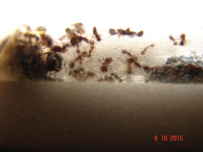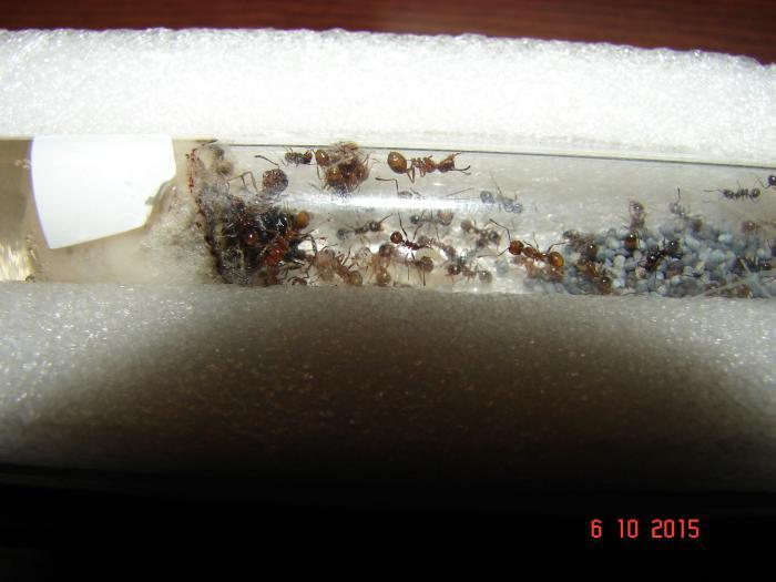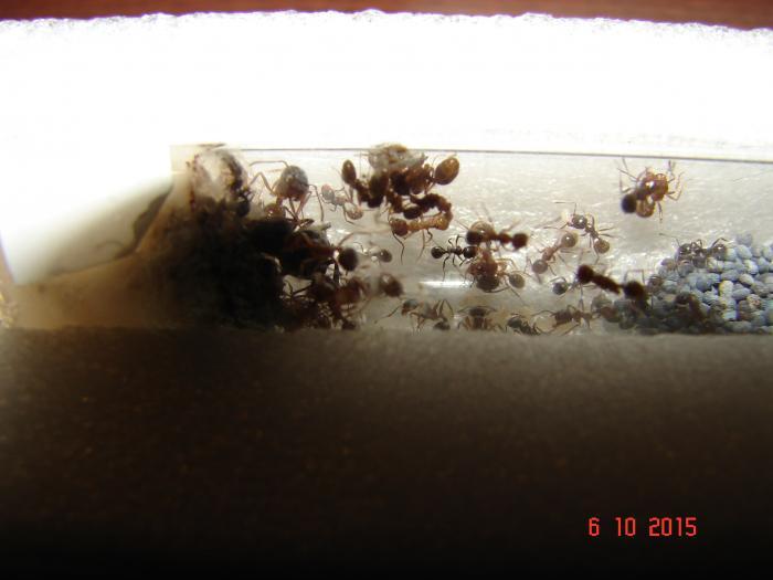 Хочется отметить что приехали ко мне пока что по примерным подсчетам около 30-40 рабочих, некоторые еще рыжие (их большинство) и совсем мало черных. Насчитала 8 личинок (может и больше, трудно разглядеть, инкубатор немного испачкан изнутри) и 2 куколки крупняшки)