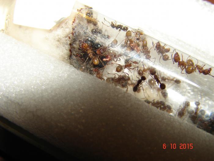 я им вчера потолкла семян, видимо сытые) даже на арену не вылезают) 1-2 шарятся изредка и мусор выносят периодично, забурились и сидят переваривают) видимо им пока что более чем всего хватает) сушеную курицу перетащили к яслям и кормят большую муравьишку мамочку(с) доча и мелочь) наконец то пересчитала расплод - пакет яиц штук 5 ( не было их столько, думаю курица все таки повлияла), 8-10 личинок и 3-5 куколок) точно говорить трудно т.к. стараюсь не беспокоить особо светом, хоть и не особо реагируют на него.