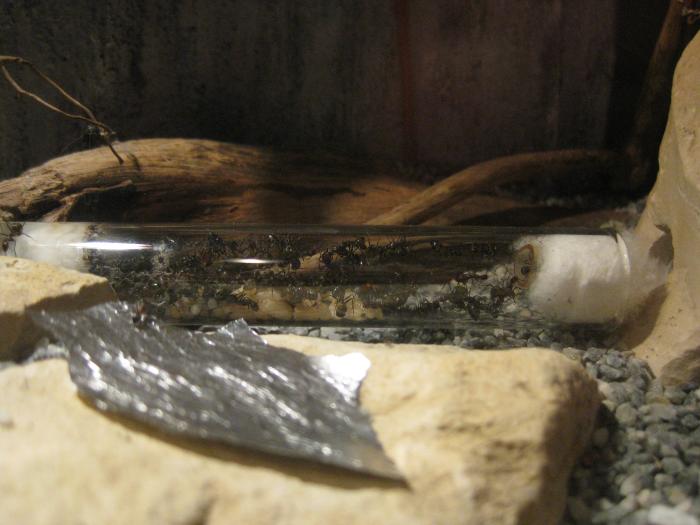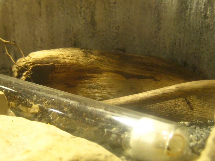 В этом году зима-какая-то вообще не зима!) Отправить муравьев в холодильник нет возможности,поэтому они "остывают" в мастерской.И то в ней держится постоянно +15. И пока часть муравьев активна решил поэкспериментировать,вернее побаловаться с ними. Эти муравьи не большие любители влажности,всегда держаться в самой сухой камере(влажность около 30%) и решил и подключить "деревяшку".В общем и коротко-чихали они на нее. В первый день там тусило около 20 рабочих,второй день вообще никого,сейчас(7 день) 5-10 рабочих. И то я думаю,сейчас бродят в нем просто из интереса,нежели с какими-то планами на заселение.(формикарий наглухо затемнен,влажность 12%). Собственно пишу это для тех кто спрашивает:какое дерево выбрать,или колония 50 муравьев,не идут в дерево...