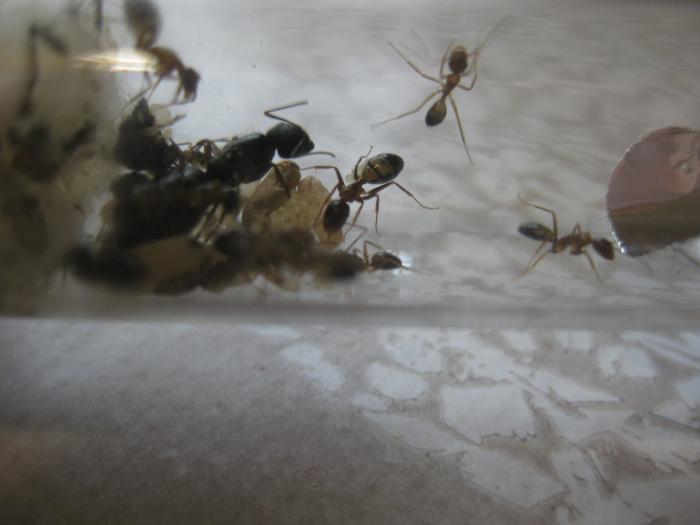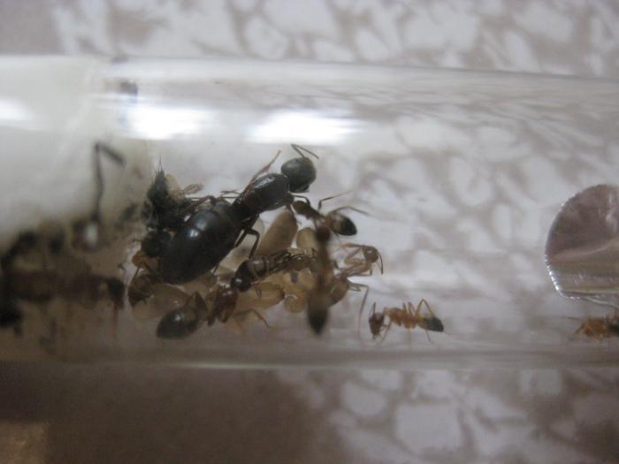 Давно ничего не писал,потому что нечего. Ников подарил еще летом,сейчас живут в Беларуси.А у Camponotus sachalinensis все стандартно: выход из зимовки,быстрое развитие до коконов,новые рабочие,яйца,снова личинки и отдыхать.Весь этот бурный процесс занимает от силы месяца 3.Количество в колонии выросло примерно до 150 особей. Пришлось подключить арену по-больше,потому что они перестали вести себя скромно как раньше,активно бросаются на руки.В отличии от других "кампов",что у меня были эти не такие агрессивные,предпочитают собирать мертвечинку чем атаковать живой объект и еще они почему-то не очень дружат с гладкими поверхностями(примерно как бегунки).Все,снова зимовка!