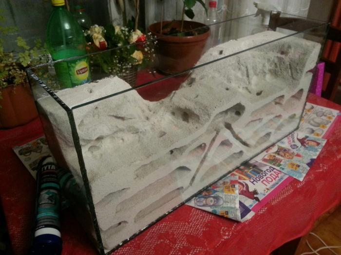 С выбором материала я определился тоже довольно таки быстро - пенобетон. Лёгкий по весу, лёгкий в обработке, шершавая поверхность, хорошо держит влагу, делай с ним что хочешь!) Гипс я отсеял почти сразу - не понимаю, зачем столько мороки! Лепить пластилин заливать, сушить, ещё и в итоге как то не очень красиво получается, если честно. Думал насчёт песка, но тоже отсеял из за возможности обрушения, и того, что мураши будут делать ходы ни разу ни на виду.