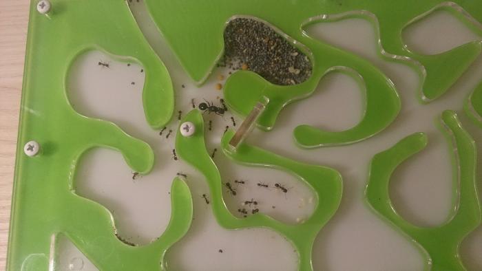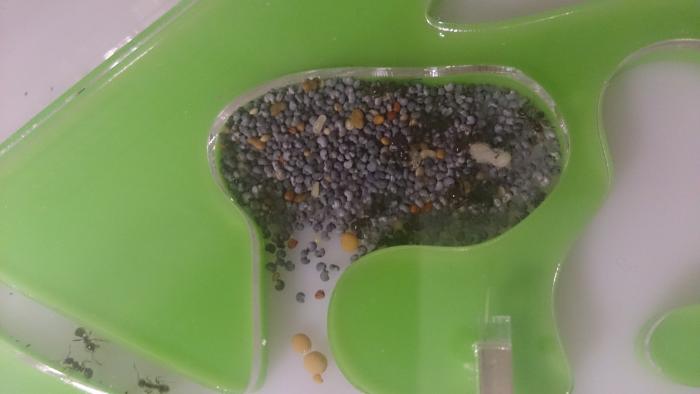 Касаемо расплода - до недавнего, весь лежал в одном месте и там же обитала королева. Потом часть расплода переехала на склад, а с сегодняшнего дня наблюдаю по всему формикарию.