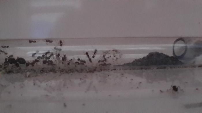 Я выпустил их из пробирки на около 50. Забрались в формик и четко заняли 3 основные камеры: королевские покои, амбар, ясли.