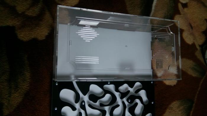 Можно такой формик поместить внутрь арены из акрила. Скажем, сделать с тыльной стороны формика потайные головки и сделать ещё пару отверстий для длинных винтов, которые будут скреплять формик с задней стенкой арены. Должно получиться что-то подобное:
