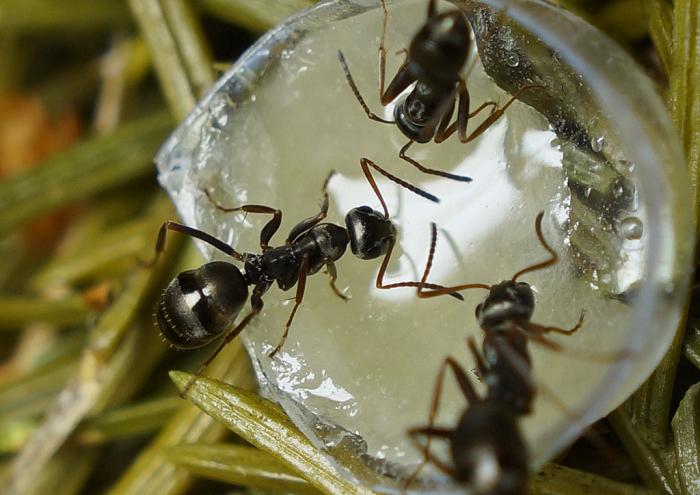 Переселение прошло удачно и быстро. На арене иголки елки пожаренные в микроволновке 2 раза по 1 минуте. Фото через стекло формикария сделать пока не получается, чуть запотело, зато с арены прилагаю: Мед