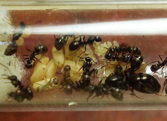 Рабочих муравьев 15 шт, примерно столько же еще коконов. 2 новорожденных появилось сегодня, есть личинки уже второй кладки этого года.
