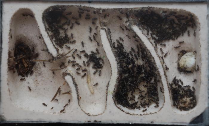 А! Так я просто мелкого кинул, со спичку толщиной. Никаких линек не ждал, как есть, так и ушел к аргессорам. Сегодня его утащили ближе к личинкам, толпой сидят вокруг, разбирают.
