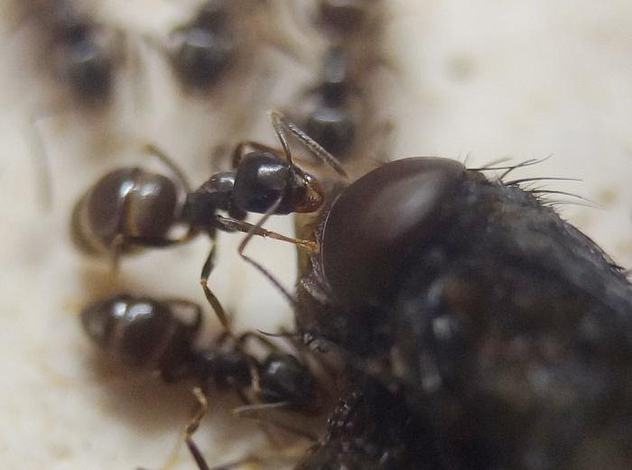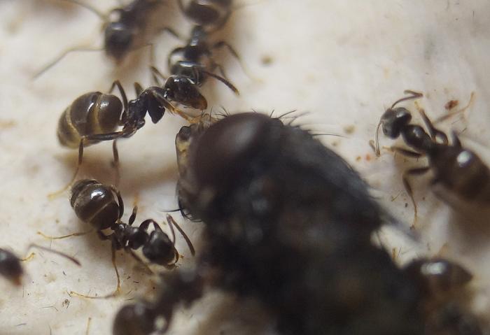 Собственно говоря, заняться в выходные муравьям было чем. Из опарыша вылупилась молодая муха. Кстати, зрела она прямо на арене, где ее никто не трогал. Вылупившись, так уж получилось, что процесс мне повезло наблюдать, она опрометчиво ринулась в формикарий, где ее достойно встретили.