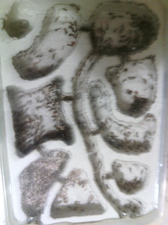 Много,тесно,жарко. Так как бегунки отказались от своего формика он отдан сервикам)) и принят с радостью. Заселение началось сразу, уже через десять минут в новом блоке был расплод (которого как я думал нет), через час уже нельзя было сказать какой блок был первым,распределились равномерно, оказалось и куколки есть и личинки, просто видно не было под массой тел. Ещё появились горы гипсовой крошки, оказывается бегунки активно меняли ландшафт перед уходом, а сервики все это собрали в сугробы, и на арену выносить не спешат, зато тащат в этот "снег" личинок для окукливания.