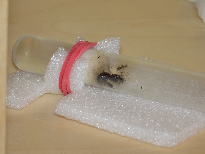 Муравьи пришли активные. Сразу после установки инкубатора(соответственно, когда перестал трясти) перетаскали коконы и расплод с ватке и принялись активно разгуливать по пробирке, не заморачиваясь, где у них пол, а где потолок. Сделал им медового сиропа (1:3 - 1:5), капнул на фольгу, но ажиотажа это не вызвало. Пока к сиропу не прикасались.