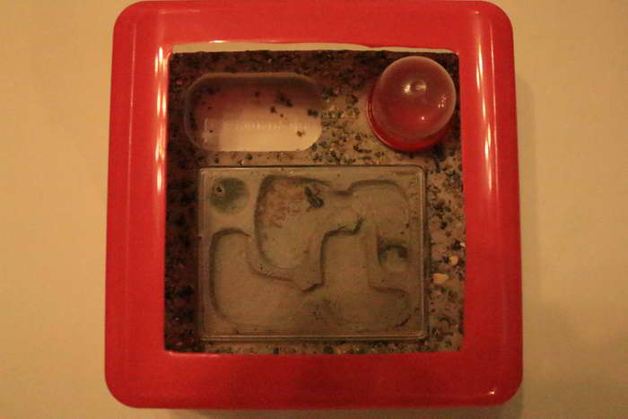 Через несколько часов к капле прилип расплод, а самка начала "буксовать". Пришлось крышку снять, при этом отвалились гипсовые стеночки, граничащие с корпусом формикария (в целях экономии места они были очень тонкими), но это не критично. Муравьи, конечно, всполошились и начали бегать, исследуя открывшееся пространство, но вскоре успокоились, и вытертую крышку удалось поставить на место.