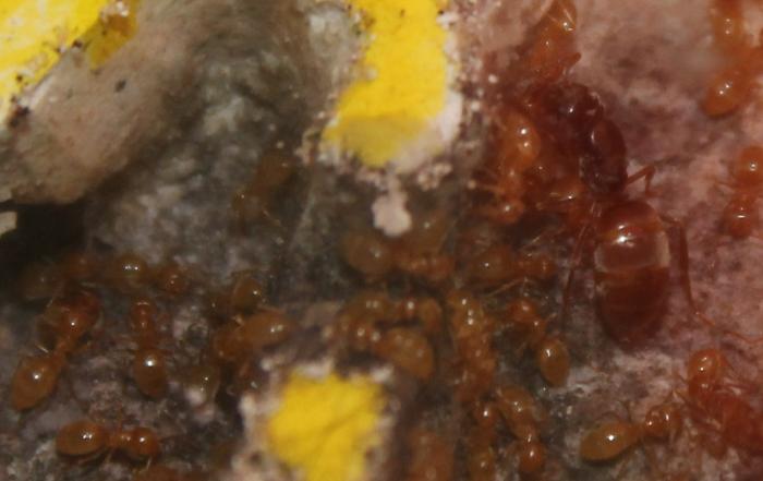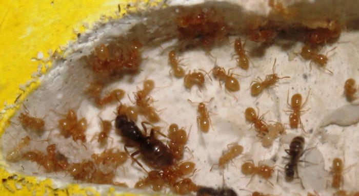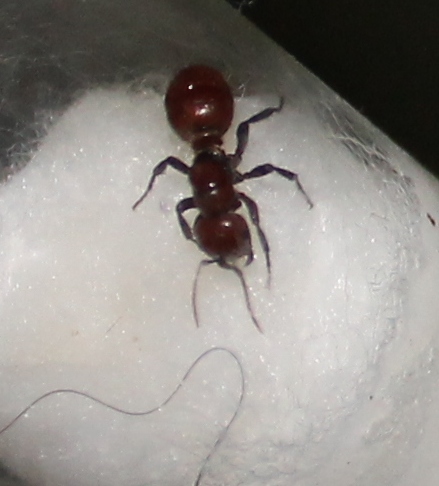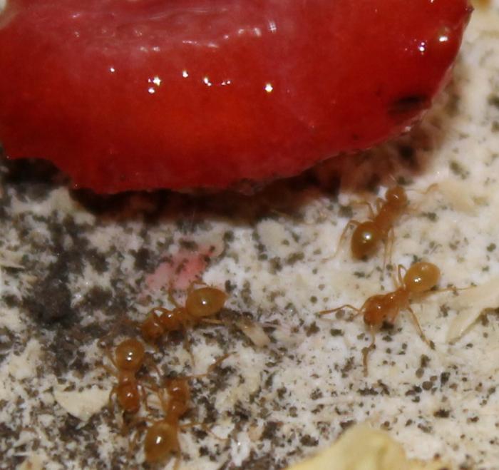 Инкубатор стал слишком грязным, и тут мне в руки попался формик, сделанный для тренировки. Переселились в затененный форм в течении 7-10 часов. под конец наблюдал, как один желтопузик вылез из формика, прибежал в пробирку и на полной скорости влетает в кусок грязи у ватки. зарывается, и через пару секунд выбегает с почти прозрачным рабочим в жвалах. Вообще семья очень активна, списываю такую активность на размеры арены. Постоянно кто то штурмует стены арены, любую добычу находят сразу и тащат ко входу.