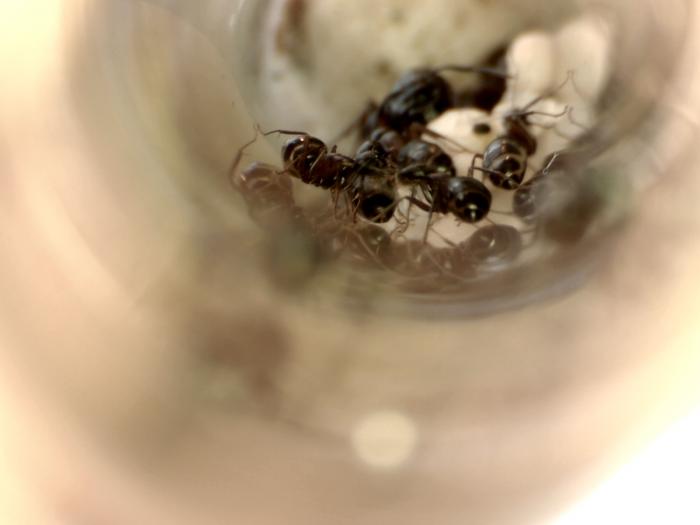 Муравьи распробовали окуклившихся опарышей, так усердно выедают, что только за усиками трещит, освоили поилку из коробочки для бахил, это меня очень порадовало. Через месяц переселяемся в новый дом.