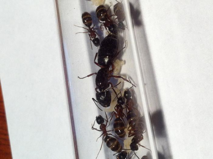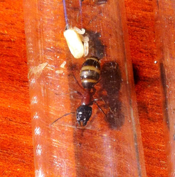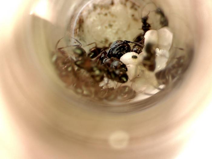После вылупления 6 рабочих матка перестала ухаживать за расплодом. Вылупившиеся начали чистить яйца, кормить личинок, ухаживать за ними и маткой, распределять пищу, так у меня появилась колония Camponotus herculeanus.