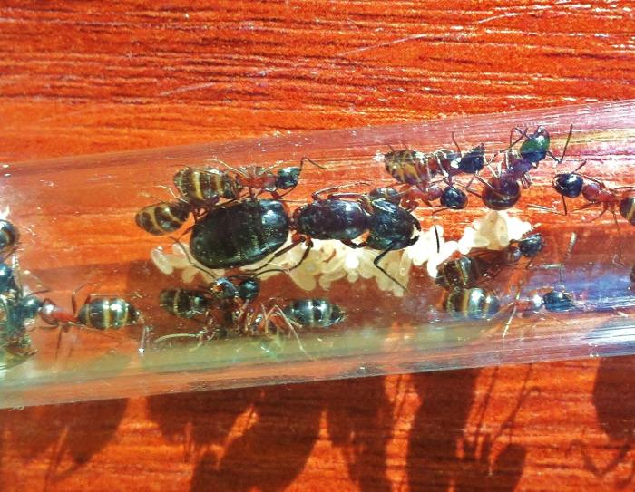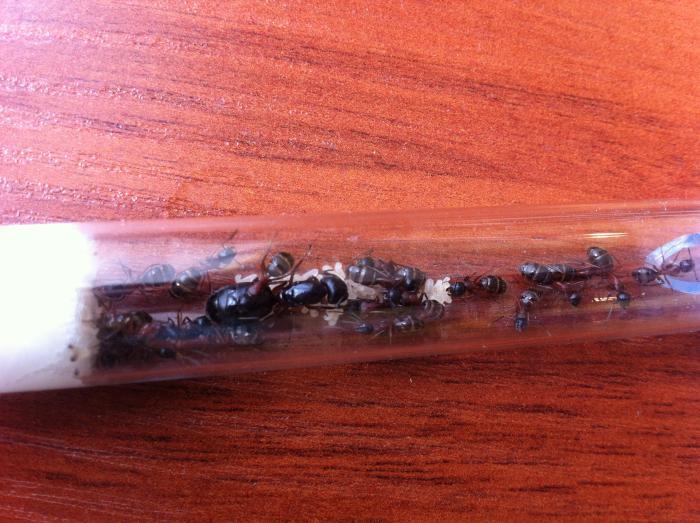 Все обошлось, погода последние два дня стояла жаркая, и я закинул большую партию чешуйниц, все эти факторы повлияли на колонию благоприятно, и личинки начали быстро развиваться, весь белковый корм в пробирке исчез за один день, мураши не перестают радовать, и скоро я запущу их в новый большой дом.