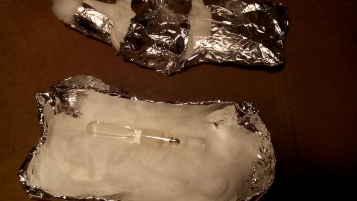 Состав : Половина бутылочки , фальга , вата .