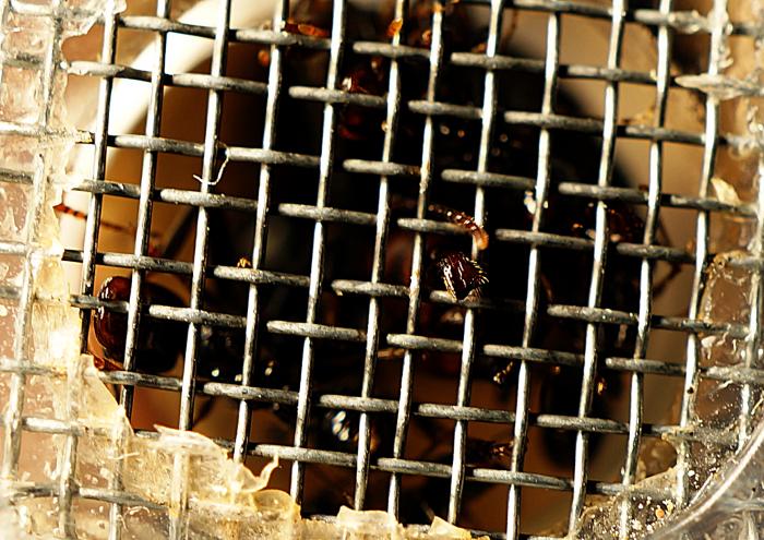 Иногда бегают одинокие барбарусы снаружи формикария. Я сначала думал, что они убегают, когда я открываю крышку. Так оно и было. Но вот сегодня, пытаясь отловить мелкого барбаруса, бегающего по наружной стенке формикария, мне это не удалось и по причине той же, по которой он оказался снаружи. Ускользнул он от меня через сетку вентиляции. Буду менять. А сетка в настоящий момент стоит от кулинарного брызгоуловителя. Шаг сетки 1мм. Хотел ее и для нигеров использовать, но решил, что крупновата будет. Правильно решил.