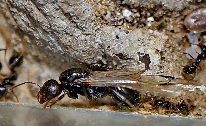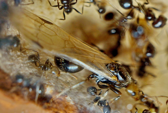 UPD. Основательница колонии обнаружена в здравии. Поэтому классифицирую событие как "появление крылатых особей". Жаль, только, что понаблюдать за ними не удалось.