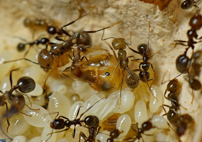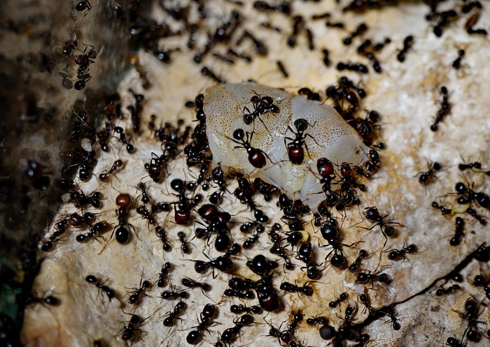 Опарыши, коих я скормил колонии не одну сотню, перемежая с рапсом и креветками уже четвертый день лежат на арене аккуратной кучкой и совершенно не представляют для муравьев интереса. Зажрались? Нагуливают мух? Консервы? ;)