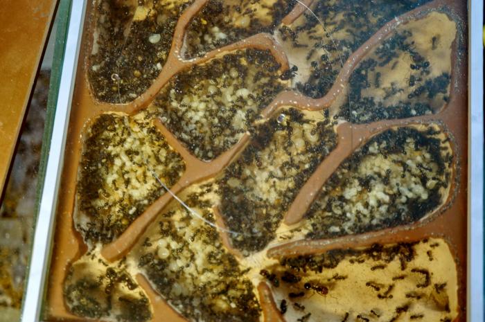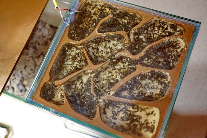 Благодаря масляному нагревателю весь расплод сосредоточен в верхних камерах. Но я чувствую, что они (муравьи) все-таки что-то затевают - cтоило заглянуть в камеры увлажнения со стороны дна.