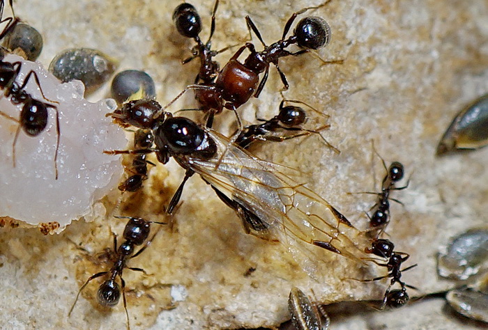 Крылатая самка вылезла и любезно согласилась мне попозировать. Чем я воспользовался. Были незначительные потуги сородичей обкусать ей крылья, но в целом путешествие по арене было спокойным.