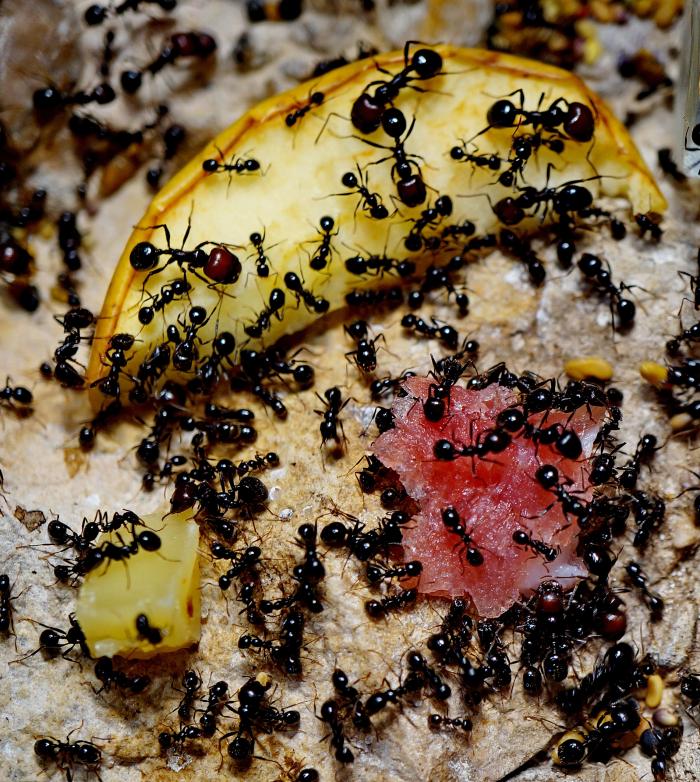Вчера положил на арену кусочек яблока, срез говядины и небольшой кусочек твердого сыра. Если с яблоком и говядиной все понятно, то сыр положил ради эксперимента, предположив, что муравьи сами себе диетологи. Сыр настоящий твердых сортов, 40% жирность. Утром не обнаружил даже следов банкета. Накрыл поляну снова.