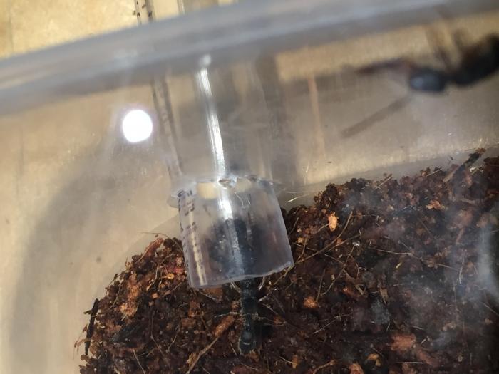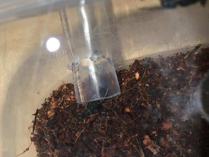 Интересное наблюдение. Когда матка сыта, то она заделывает ход в формикарий и в течении дня занимается своими делами, к вечеру она распечатывает ход и ждет...ждет пока я закину живую муху которую она убьет, съест( от мухи почти ничего не остается. Матка предпочитает съедать грудку) вынесет на арену и потом снова запечатает ход