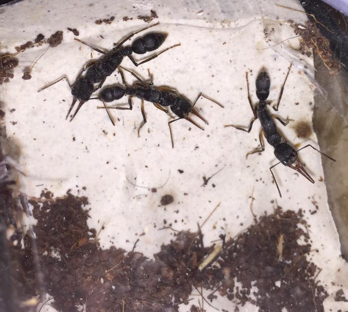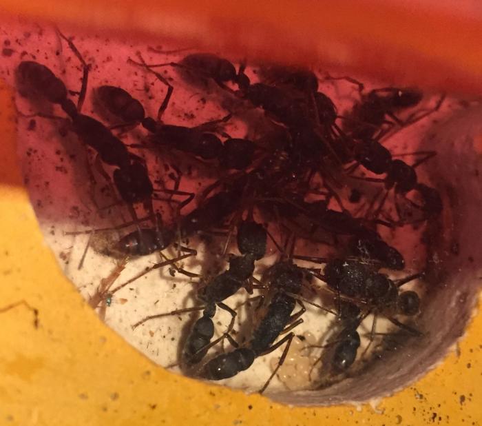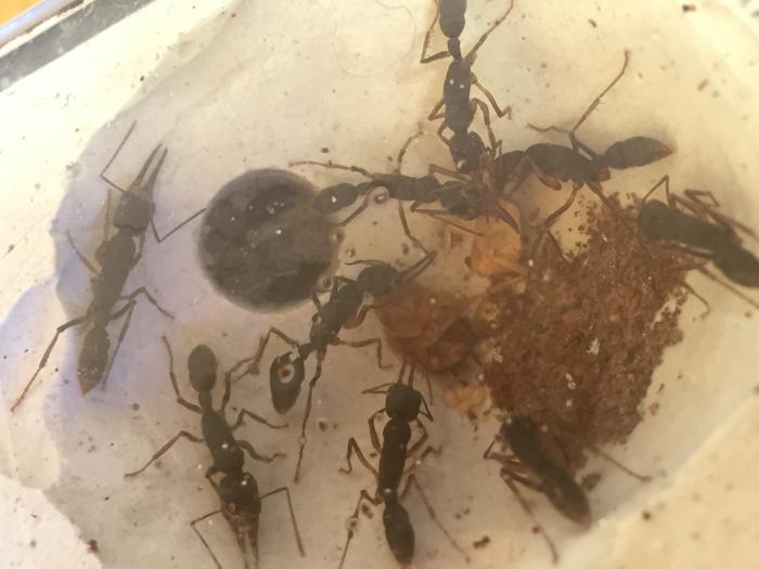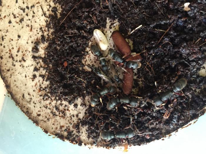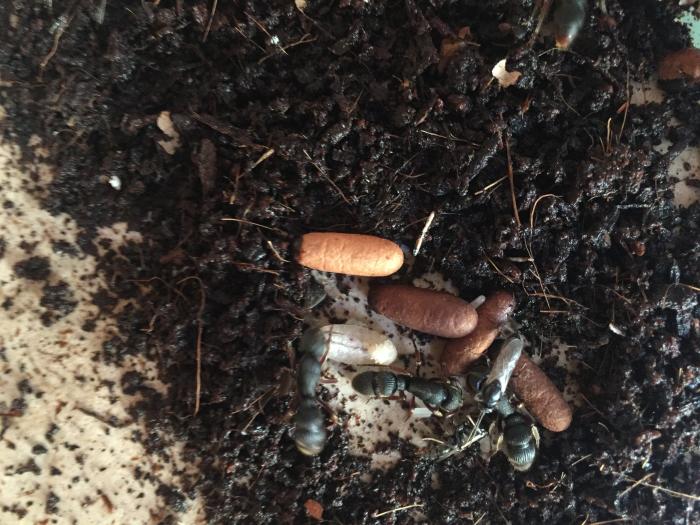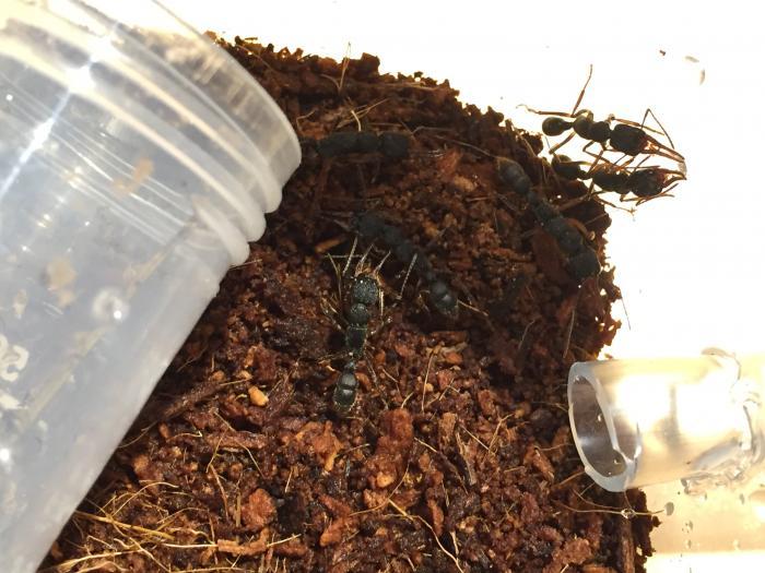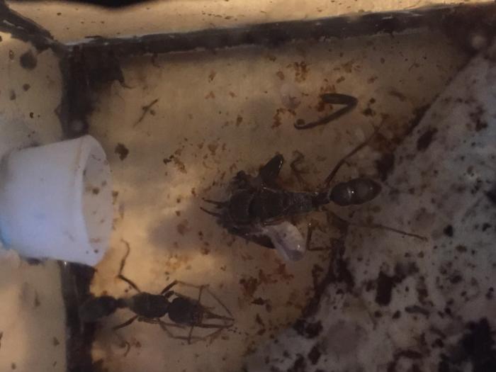 Сейчас у меня есть три колонии псевдонеопонер, в двух из них развитие идёт стабильно, в одной колонии 3 штуки, в другой 8. В третьей же колонии всё не так хорошо. Рабочие переодически погибают, как и личинки, причина мне не понятна, но надеюсь всё будет хорошо. Подсадка самцов одной колонии к пабочим другой колонии успехом не увенчались( пока что) самец пытается спариваться, но стоит ему залезть на рабочего как другой рабочий попросту стаскивает его, можно пердположить что это некая конкуренция и они просто не дают друг другу спариваться.