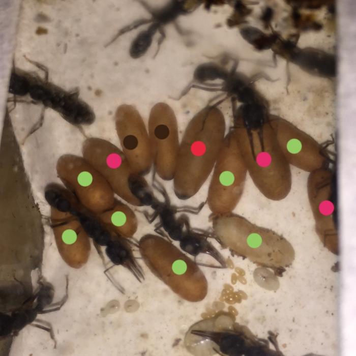 Часто не редко, так что ещё одна интересная запись. Вот так можно определить по коконам кто же там, не со 100% уверенностью, но вроде как да. Красные-матки, чёрные-самцы, зелёные-рабочие