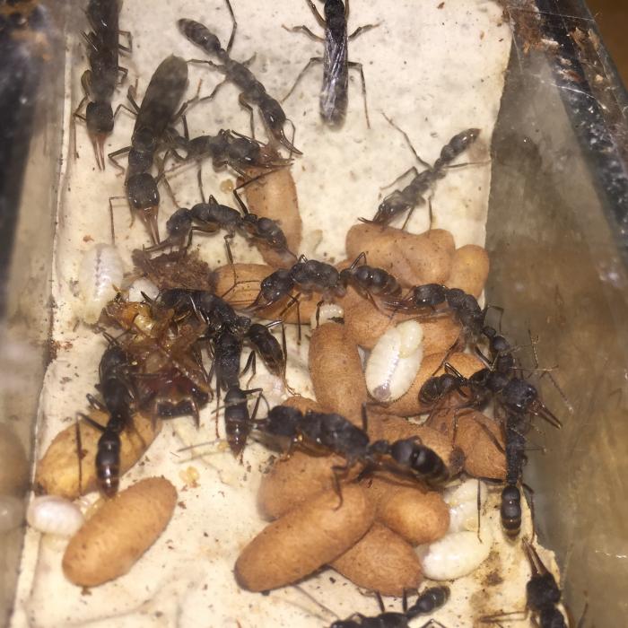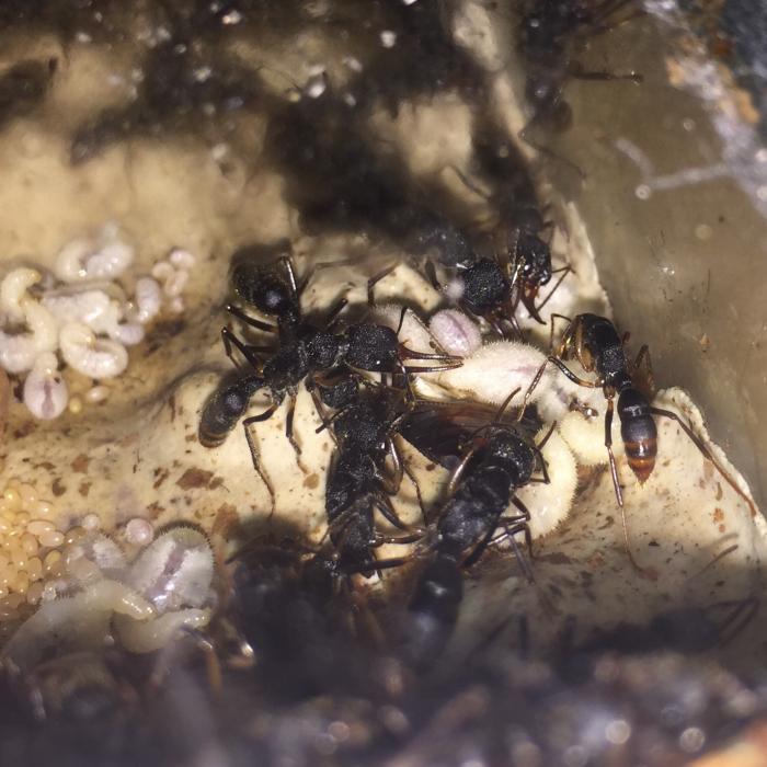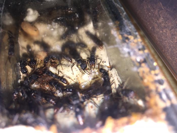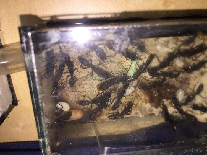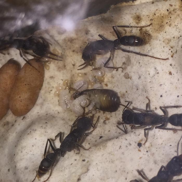 Сейчас в колонии необычно много личинок, около 30, может больше. Они поглащают очень много белковой пищи, иногда по два взрослых туркменских таракана в день! На фото они едят крупную нимфу суринамского таракана, которая жила на арене венаторов почти 5 месяцев