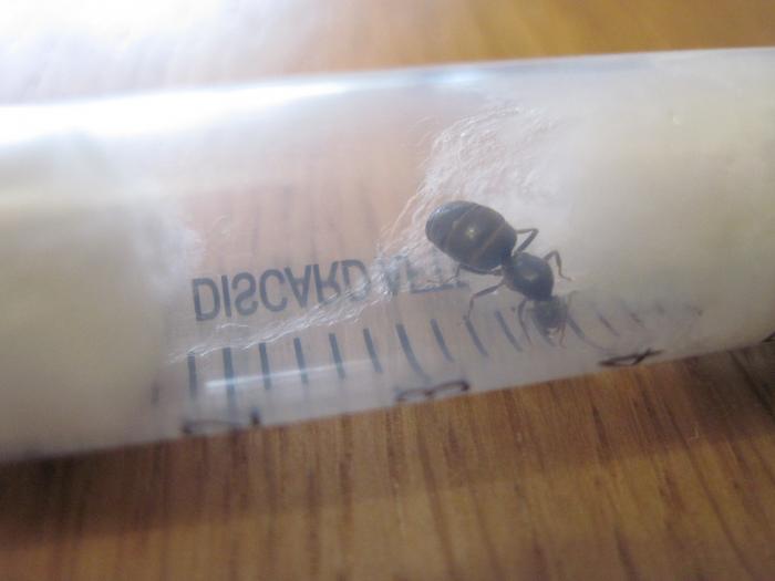 И вот ведь как! Попалась самка лазиусов. По виду - нигер. Нормальная самка прошлого года уже давно должна быть с семьей. Теоретически возможны разные варианты, откуда она взялась. Для начала поселил её в инкубатор. Если внутри есть паразит, как предположил mehraban -- паразит должен выйти.