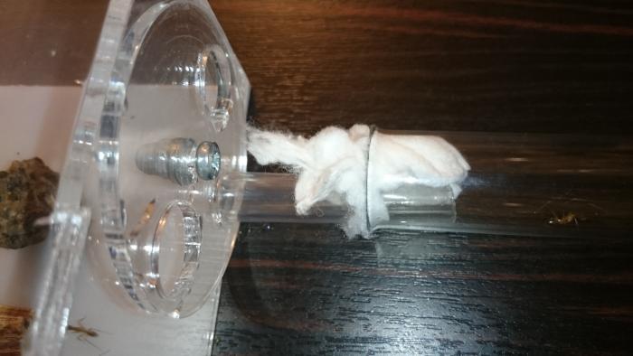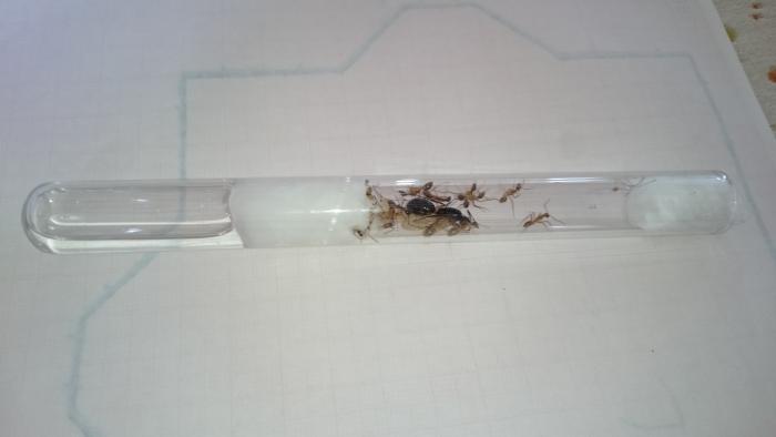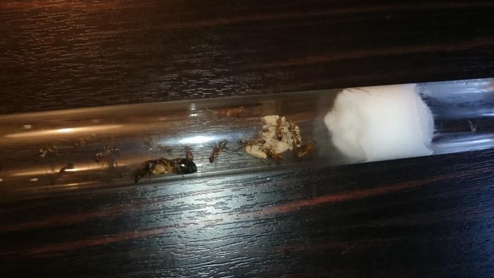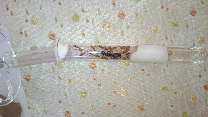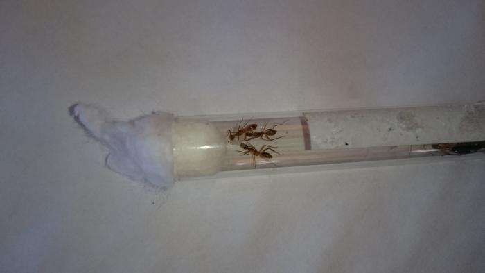 Здравствуйте, дорогие мирмикиперы! Я переселил своих кампов в новую пробирку, так как в старой ватка была очень грязная. И родилось двое рабочих. Фотография прилагается.