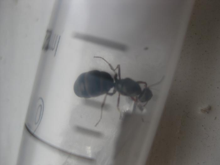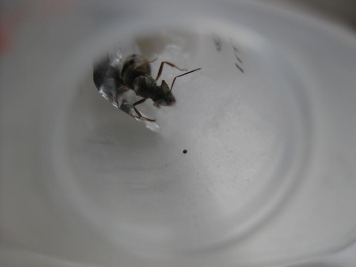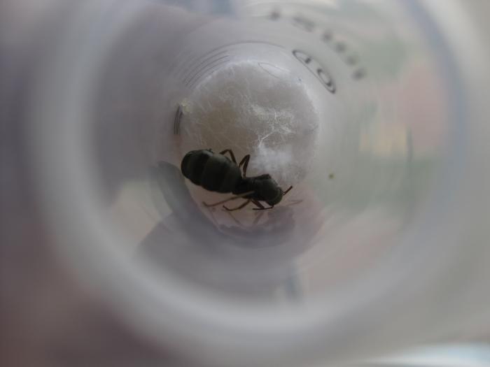 Что за вид? 11-12 мм. быстрая, агрессивная. Нашел на трасе, посадил в инкубатор(шприц) через день отложила яйца (на фото видно)