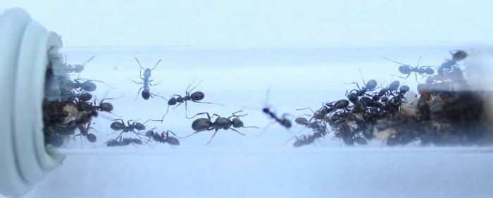 В многоматочной колонии вывелись все коконы, а муравьи скучились в двух камерах и игнорируют белок. Поскольку колоний, желающих отправиться на зимовку в холодильник, хватает, место надо экономить. Выселила колонию в пробирку (фуски - не флавусы, без долгих сборов дружно переехали). Сейчас "прохлаждаются" на балконе.