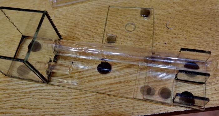 Пробирки надеваются на ПВХ трубки, зазор забивается ватой, второй конец пробирки лежит на подставке. Ножки силиконовые. Арена 50х50х50, отверстие в крышке 10мм, входы для ПВХ трубок 8мм.