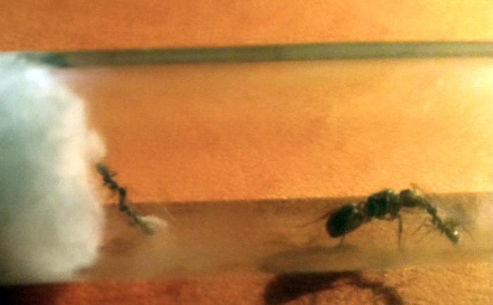 Из второй кладки - если её можно так назвать))) - появился муравей который как я заметил за всё это время никогда не участвовал в кормлении королевы, расплода и.т.д - он тупа все время стоит возле ватки у входа и сторожит вход. И я уже пару раз его ловил, так как когда хотел покормить пару раз не замечал что он на ватке. Как я открывал пробирку он как угорелый сваливал))))