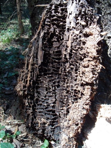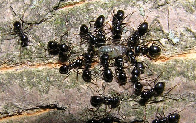 Древесный муравей. Часто гнезда сооружаются в основании деревьев. Состоит из надземной древесной и подземной части (где семья проводит зиму). Изнутри гнездо представляет собой сложную структуру из картонных перегородок, сделанных из смеси почвы, древесины, слюны дендролазиусов и тлиной пади. От гнезда в разные стороны часто могут тянутся подземные тоннели, стенки которых выстланы тем же картоном.