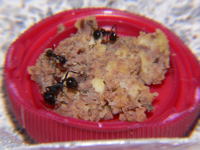 Пока что самый востребованный корм это самодельный паштет из вареных печенки и желтка. Натер все на мелкой терке и перемешал. Завернул в фольгу, в виде колбаски, и в морозилку. Теперь когда надо достал, ножом отрезал (отломил) маленький кусочек. Остальное обратно. Подождал пока оттает, кстати очень быстро, и мурашам. Моим нравиться. Правда большая часть печенки перекочевывает на мусорку.